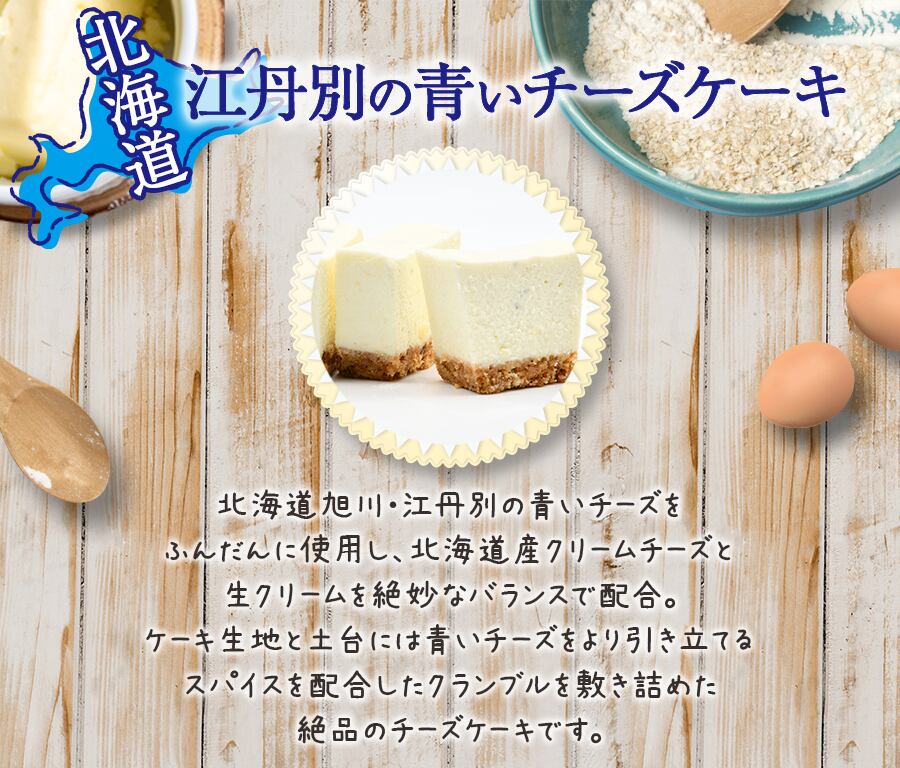 北海道旭川市の郊外、江丹別町にあるレストラン’’Chirai’’の嵯城オーナーシェフと江丹別が誇る「江丹別の青いチーズ」の生みの親、伊勢昇平氏のコラボ商品第一弾が誕生しました。江丹別の青いチーズをふんだんに使用し、北海道産クリームチーズと生クリームを絶妙なバランスで配合したケーキ生地に、青いチーズをより引き立てるスパイスを配合したクランブルが敷き詰められた絶品のチーズケーキです。